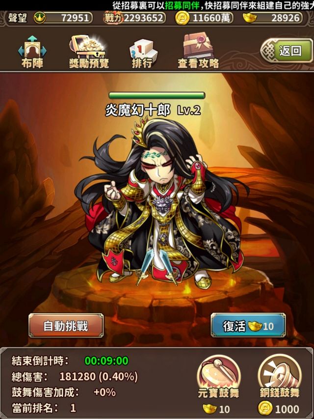 西劍創始者「東瀛魔神」炎魔幻十郎是金光布袋戲強大的戰將之一,遊戲中炎魔幻十郎將化身強大BOSS,各路英雄好漢每日指定時間都可一起上線挑戰,圍剿炎魔幻十郎,獲勝後所有挑戰的玩家將可獲得豐富獎勵。